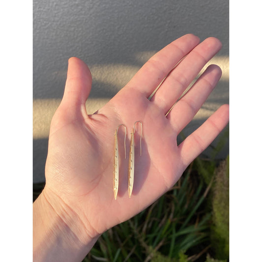 Solid 14k Yellow Gold Diamond Cut Long Leaf Dangle Earrings
