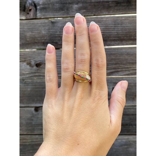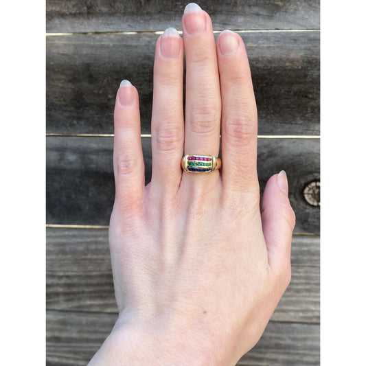 Vintage Solid 14k Yellow Gold Ruby Emerald Fluted Dome Ring - Size 6.5