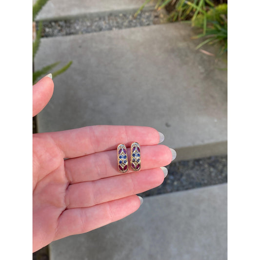 Vintage Solid 14k Yellow Gold Ruby Sapphire & Diamond Drop Earrings