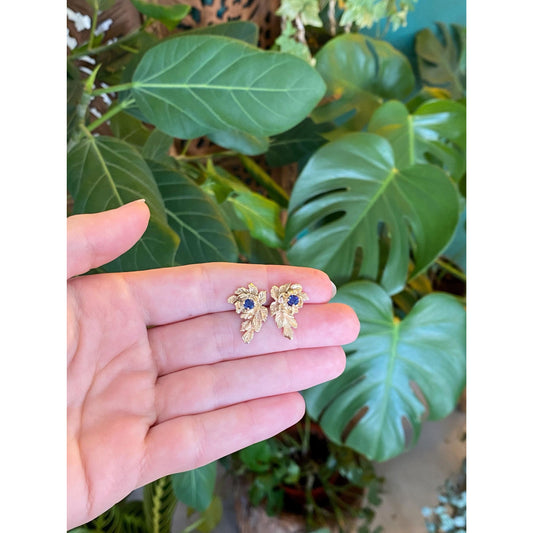 Vintage Solid 14k Yellow Gold Sapphire Flower Leaves Stud Earrings