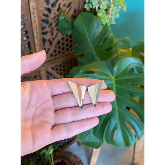 Vintage Solid 14k Yellow Gold Sapphire Folded Fan Stud Earrings