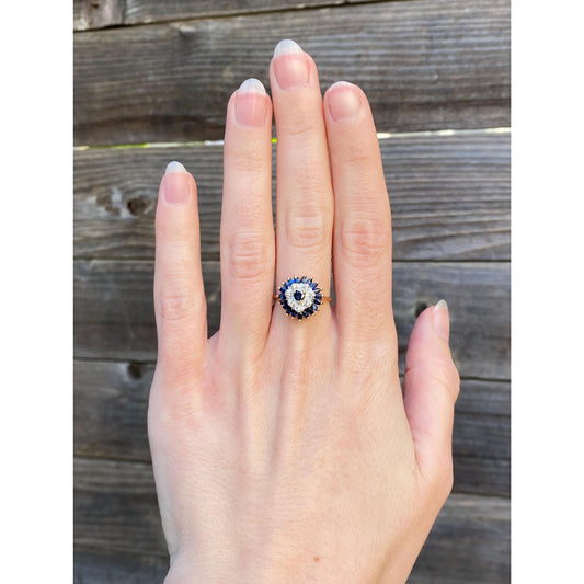 Vintage Solid 14k Yellow Gold Sapphire Diamond Halo Ring - Size 6