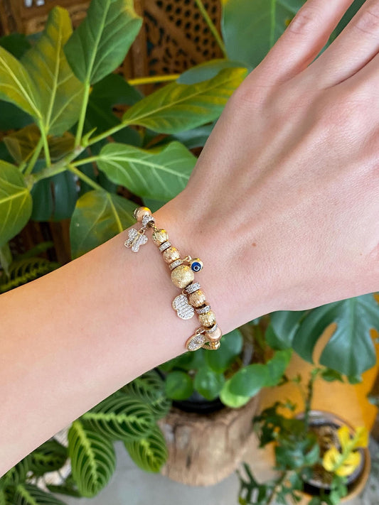Vintage Solid 14k Tri Tone Gold Cubic Zirconia Evil Eye Charm Bracelet - 6.75 inches
