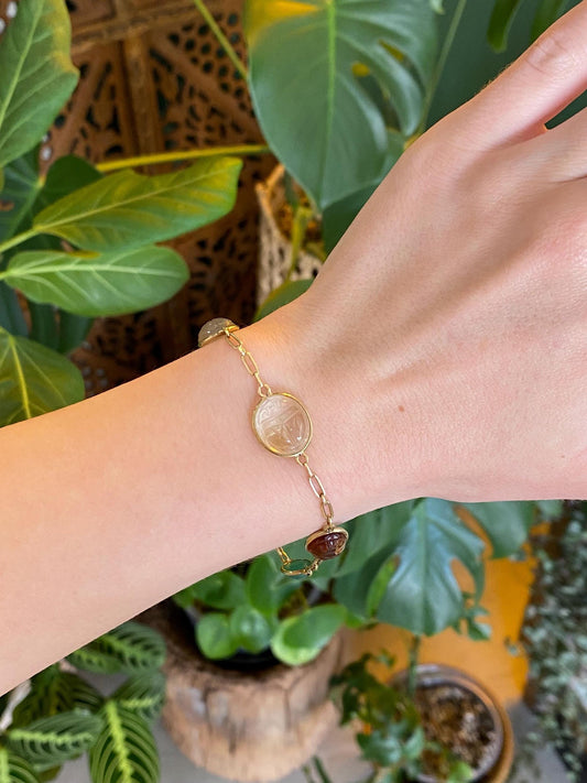 Vintage Solid 14k Yellow Gold Clear Spinel Green Chalcedony Carnelian Milky Quartz Citrine Carved Scarab Long Link Bracelet - 7.75 inches