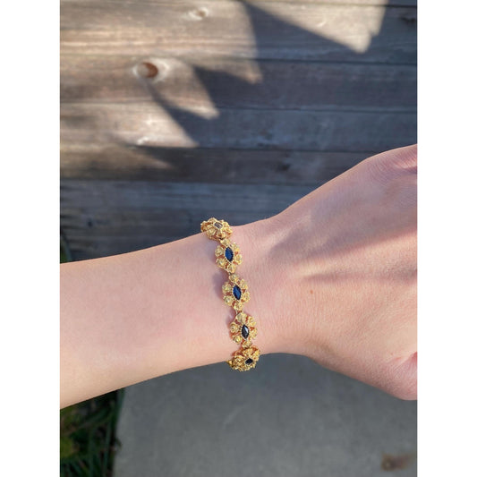Vintage Solid 18k Yellow Gold Blue Marquis Sapphire Fancy Link Bracelet - 7.25 inches