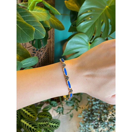 Vintage Solid 14k Yellow Gold Opal Inlay Mystic Topaz Link Bracelet - 8 inches