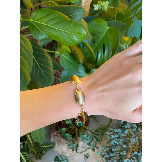 Solid 14k Yellow Gold Tigers Eye Rose & Clear Quartz Agate Green Chalcedony Carnelian Scarab Bracelet - 6.75 inches