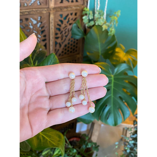 Vintage Solid 14k Yellow Gold Pearl Chain Dangle Stud Earrings