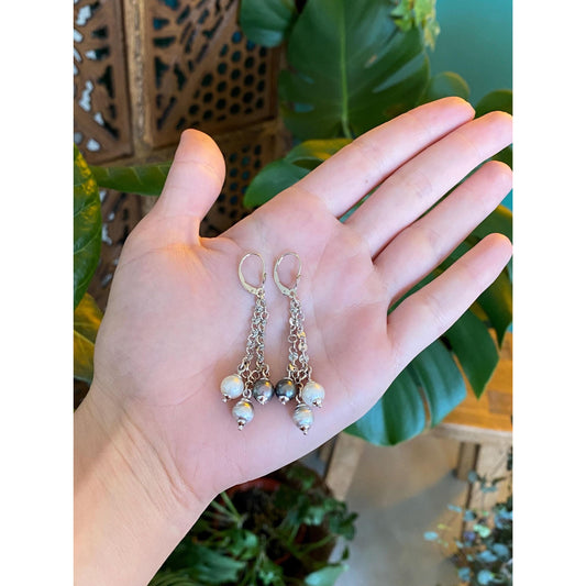 Vintage Solid 14k White Gold Colored Pearls Diamond Cut Link Chain Dangle Earrings