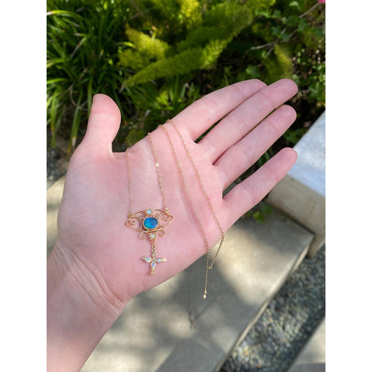 Vintage Solid 14k Yellow Gold Diamond Opal Cable Chain Necklace - 18.75 inches