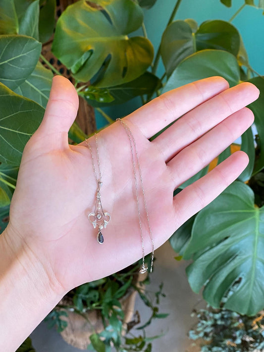 Solid Platinum Diamond Blue Sapphire Seed Pearls Fancy Chain Necklace - 15.5 inches