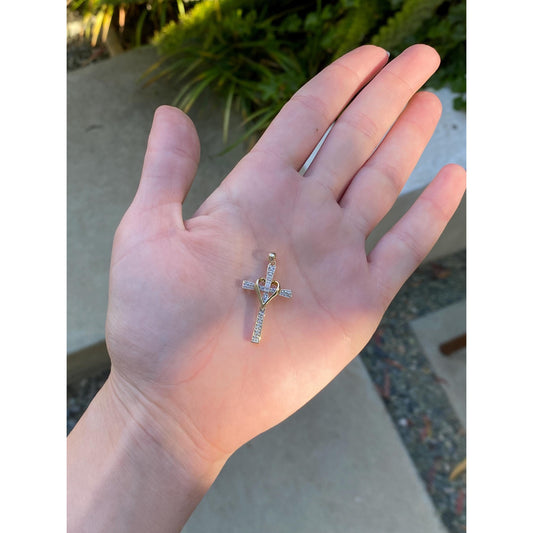 Vintage Solid 14k Yellow Gold Clear & Red Cubic Zirconia Cross Charm