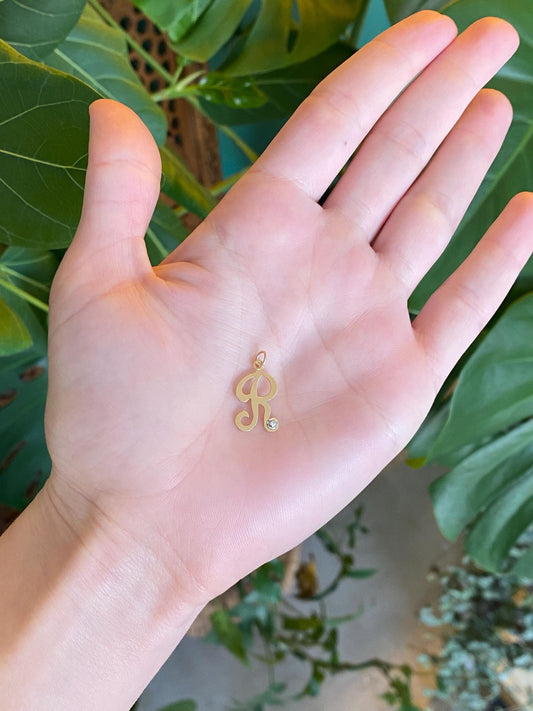 Vintage Solid 14k Yellow Gold Clear Sapphire Initial "R" Charm