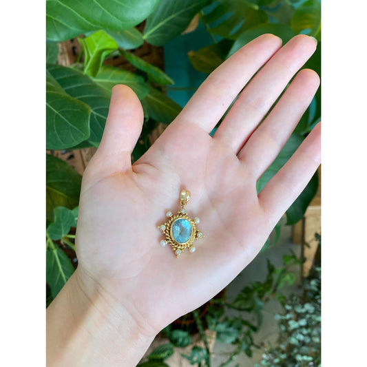 Vintage Solid 18k Yellow Gold Diamond Aquamarine Pearls Charm