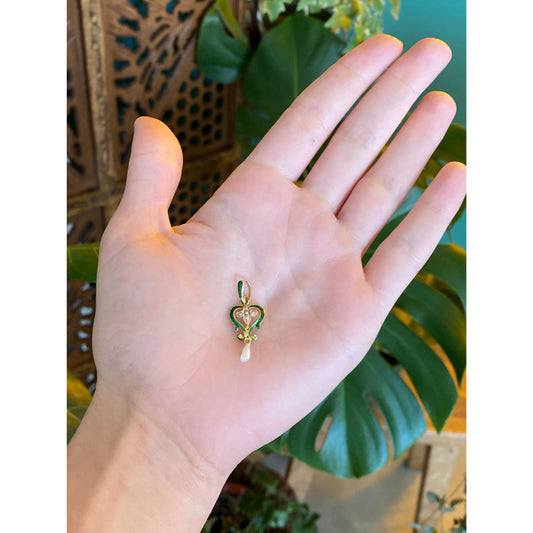 Vintage Solid 14k Yellow Gold Green Enamel Seed Pearl Dangle Charm