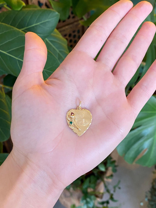 Vintage Solid 14k Yellow Gold Red & Green Cubic Zirconia Merry Christmas Heart Charm