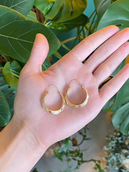 Vintage 14k Yellow Gold Pattern Hexagonal Hoop Earrings