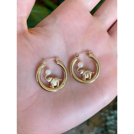 Vintage 14k Yellow Gold Elephant Pearl Hoop Earrings