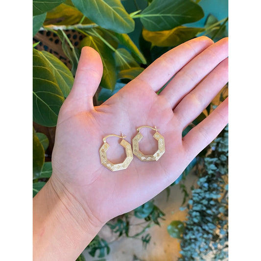 Vintage Solid 14k Yellow Gold Diamond Cut Greek Key Hoop Earrings