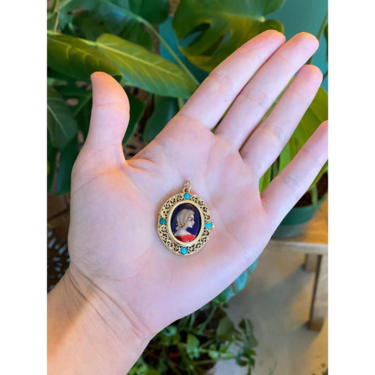 Vintage Solid 18k Yellow Gold Enamel Cameo Turquoise Locket Charm