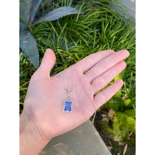 Solid 10k White Gold Blue Cubic Zirconia Pearl Art Deco Necklace - 16.25 inches