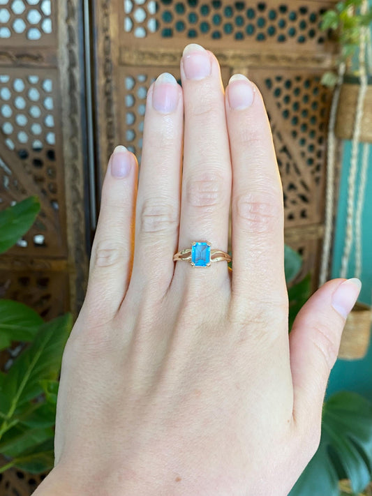 Vintage Solid 14k Yellow Gold Emerald Blue Quartz Iolite Ring Band - Size 6