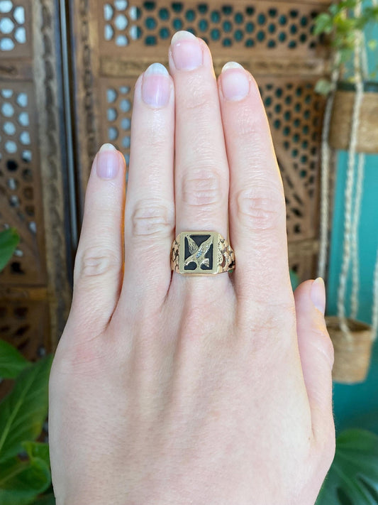 Vintage Solid 10k Yellow Gold Clear Sapphire Eagle Signet Ring - Size 10