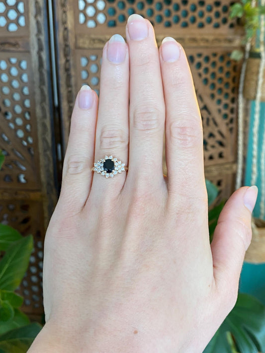 Vintage Solid 14k Yellow Gold Diamond Black Sapphire Ring - Size 4.75