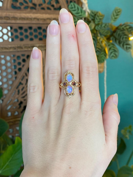 Vintage Solid 14k Yellow Gold Opal Garnet Ring - Size 7.5