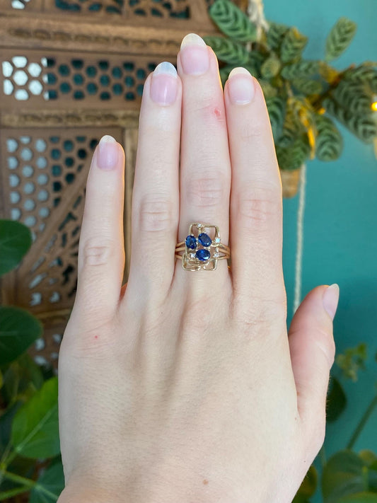 Vintage Solid 14k Yellow Gold Diamond Blue Sapphire Cubist Ring - Size 6.25