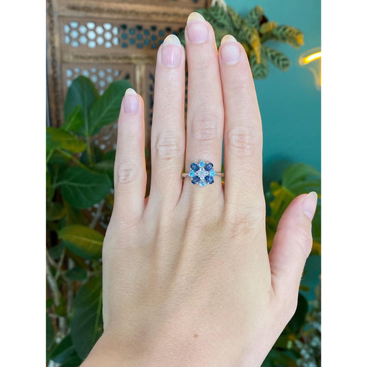 Vintage Solid 10k White Gold Clear & Blue Spinel Cluster Ring - Size 7