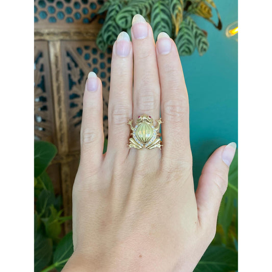 Solid 14k Yellow Gold Pink Sapphire Clear Cubic Zirconia Articulated Pregnant Frog Ring - Size 5.75