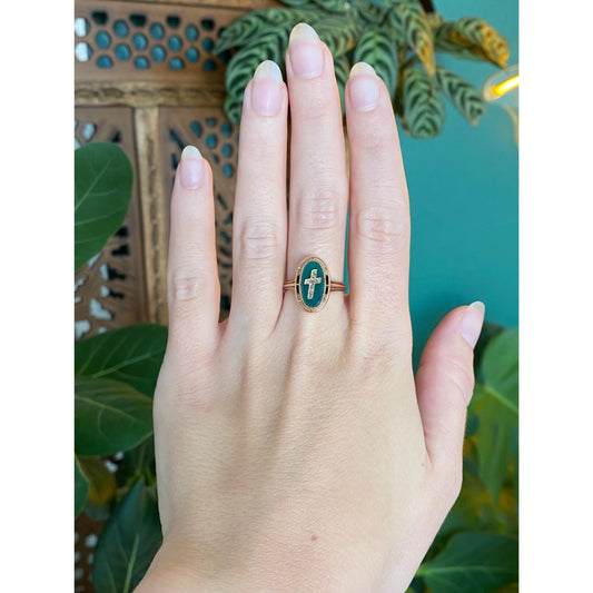 Vintage Solid 14k Yellow Gold Grey Diamond Green Stone Cross Ring - Size 7.5