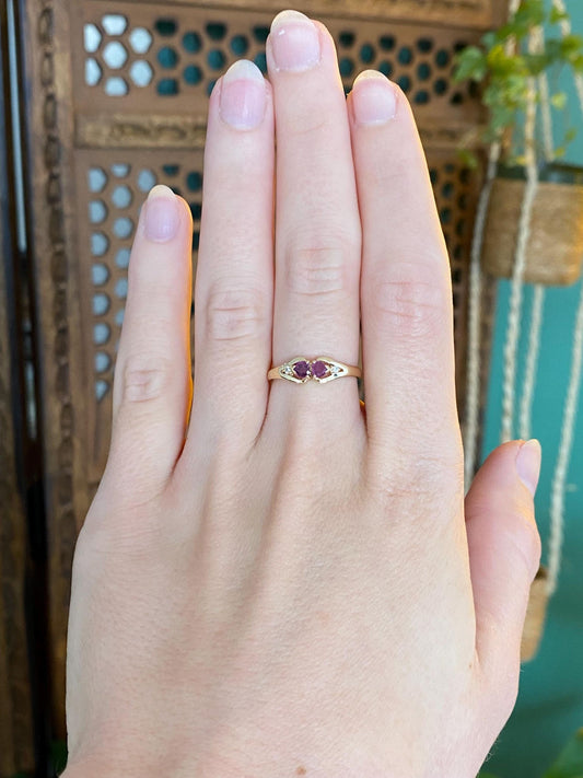 Vintage Solid 14k Yellow Gold Heart Ruby Diamond Ring - Size 6.25