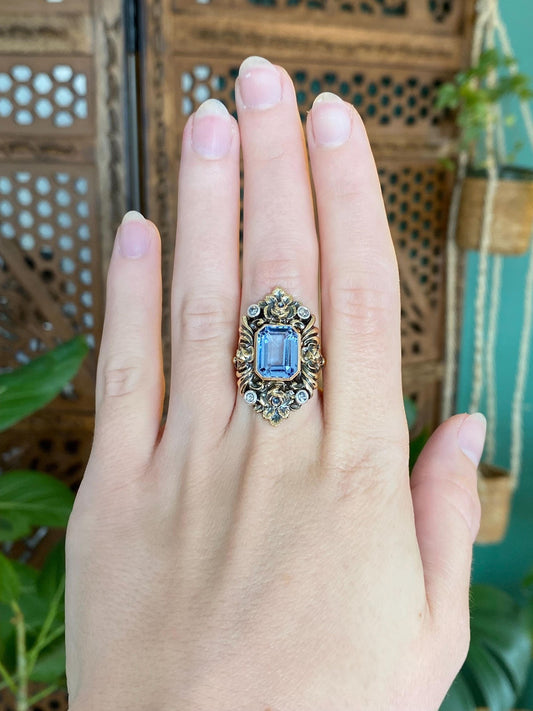 Vintage Solid 18k White & Yellow Gold Diamond Topaz Ornate Floral Saddle Ring - Size 5.25