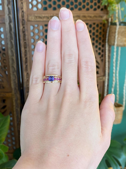 Vintage Solid 14k Yellow Gold Iolite Pink Sapphire Ring - Size 5.25