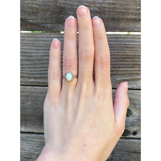 Vintage Solid 14k White Gold Diamond Halo Opal Ring - Size 4