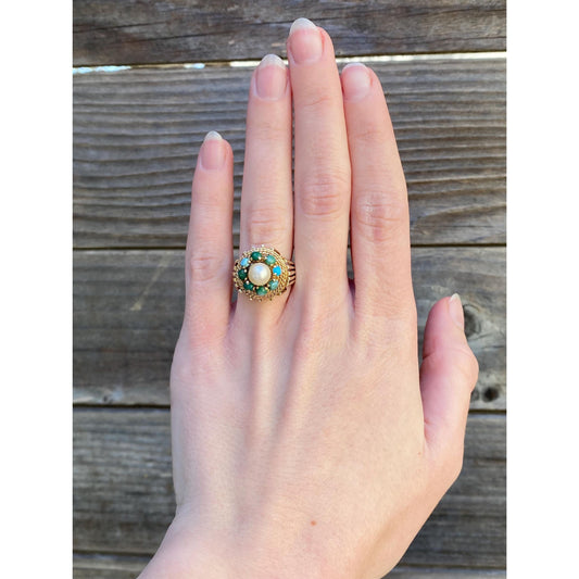 Vintage Solid 14k Yellow Gold Pearl Turquoise Halo Ring - Size 2.25