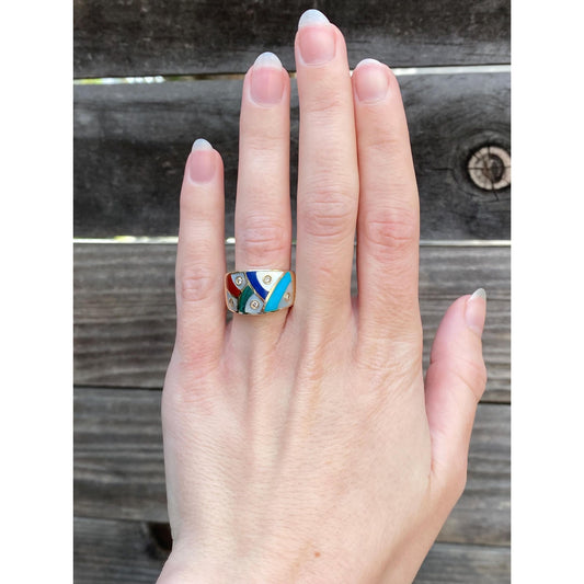 Vintage Solid 14k Yellow Gold Diamond MOP Malachite Blue Lapis Turquoise Coral Inlay Ring Band - Size 5.75
