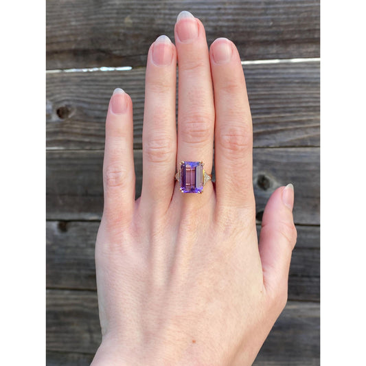 Vintage Solid 14k Yellow Gold Amethyst Diamond Ring - Size 5.5