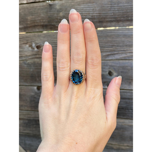 Solid 18k Yellow Gold Blue Spinel Halo Diamond Ring - Size 6.5