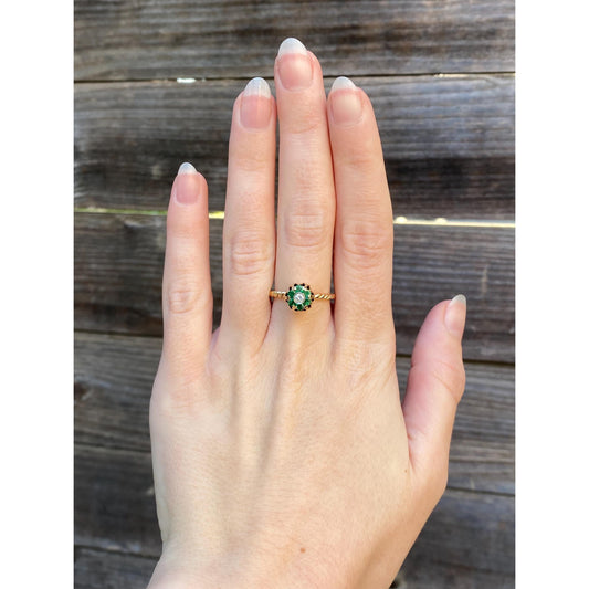 Vintage Solid 18k Yellow Gold Emerald Halo Diamond Ring - Size 6.75