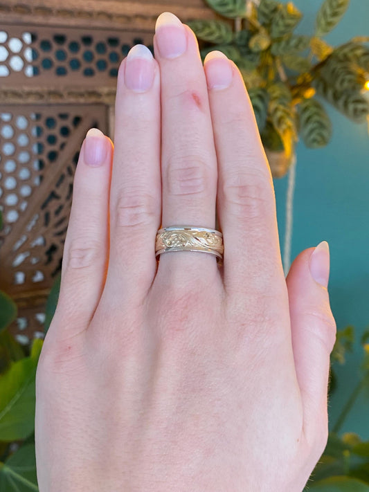 Vintage Solid 14k White & Yellow Gold Floral Design Ring Band - Size 8.75