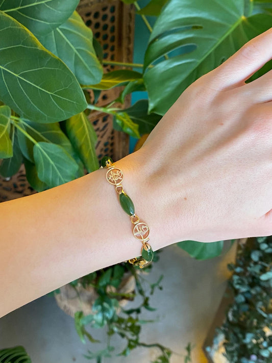 Vintage Solid 14k Yellow Gold Nephrite Jade Chinese Characters Link Bracelet - 7.25 Inches