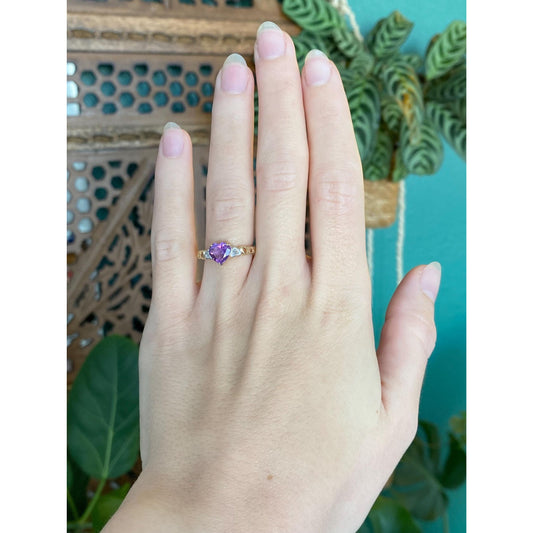 Vintage Solid 10k White & Yellow Gold Diamond Amethyst Heart Ring - Size 5.75