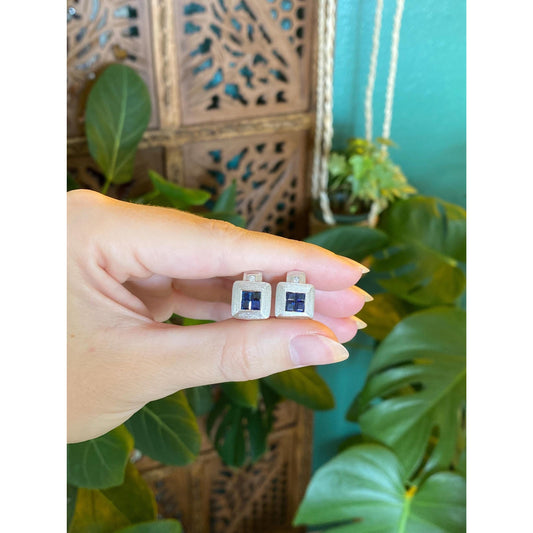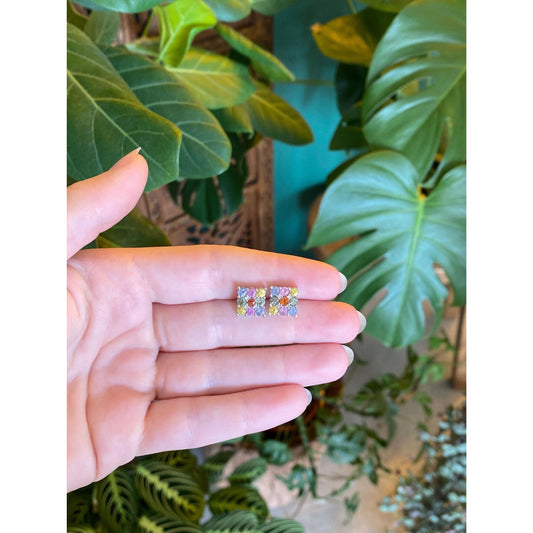 Solid 14k White Gold Diamond Colored Sapphire Square Stud Earrings