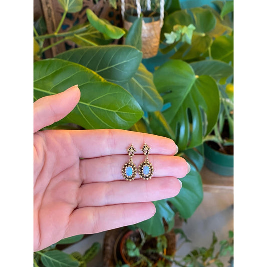 Vintage Solid 14k Yellow Gold Opal Ornate Dangle Stud Earrings