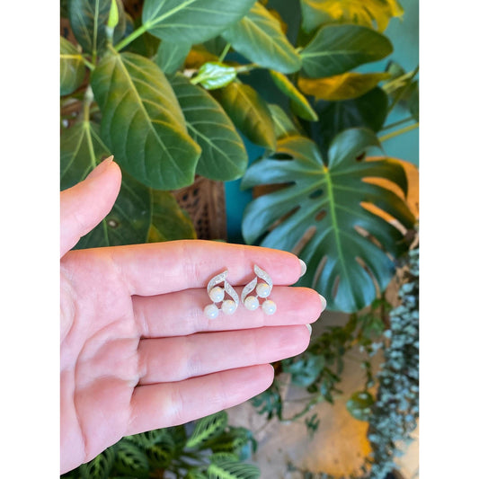 Vintage Solid 14k White Gold Diamond Pearl Stud Earrings