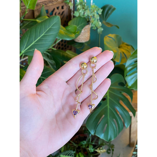 Vintage 14k Yellow Gold Amethyst Heart Spiral Dangle Stud Earrings