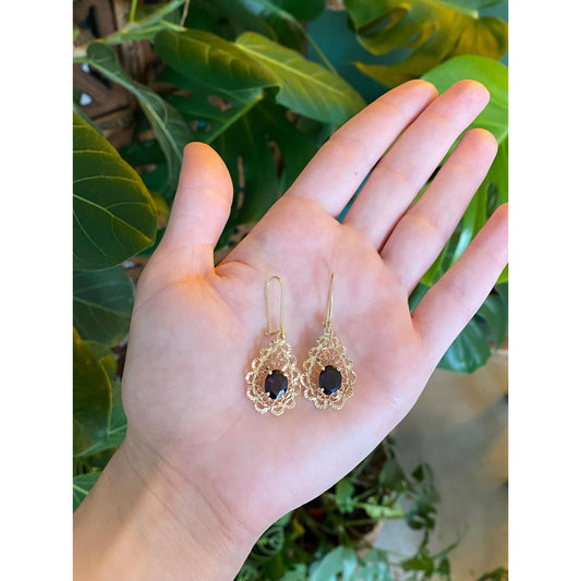 Vintage Solid 14k Yellow Gold Garnet Diamond Cut Filigree Dangle Earrings